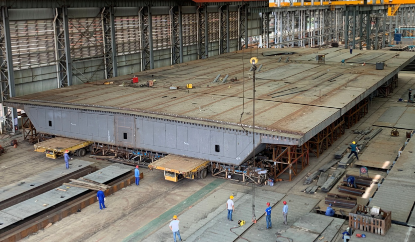 上午11時,隨著現(xiàn)場總指揮一聲令下,重達(dá)240余噸的首個鋼箱梁節(jié)段由兩臺150噸自行式液壓平板車緩緩抬起,平穩(wěn)脫離總拼胎架并駛出廠房,標(biāo)志著首輪6個節(jié)段拼裝完成并正式下胎,轉(zhuǎn)入室外臨時存放區(qū)。