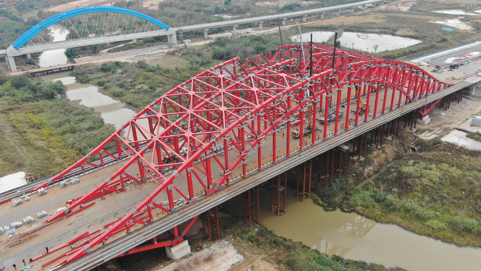 ? ? ? ?集賢路跨派河鋼桁拱橋位于安徽省合肥市肥西縣集賢路,工程北起方興大道,南至派河大道,長(zhǎng)2.78公里,寬70米,設(shè)計(jì)為城市快速路。本橋鋼梁為三跨連續(xù)中承式鋼桁拱橋,鋼梁全長(zhǎng)239.8m,上拱肋頂至橋面板高約36m,橋面板至支座高約12m,規(guī)劃三級(jí)航道。集賢路跨派河橋(方興大道~派河大道)工程完成后,集賢路將成為一條連接高新區(qū)、政務(wù)區(qū)、經(jīng)濟(jì)開(kāi)發(fā)區(qū)與肥西縣的城市快速干道。