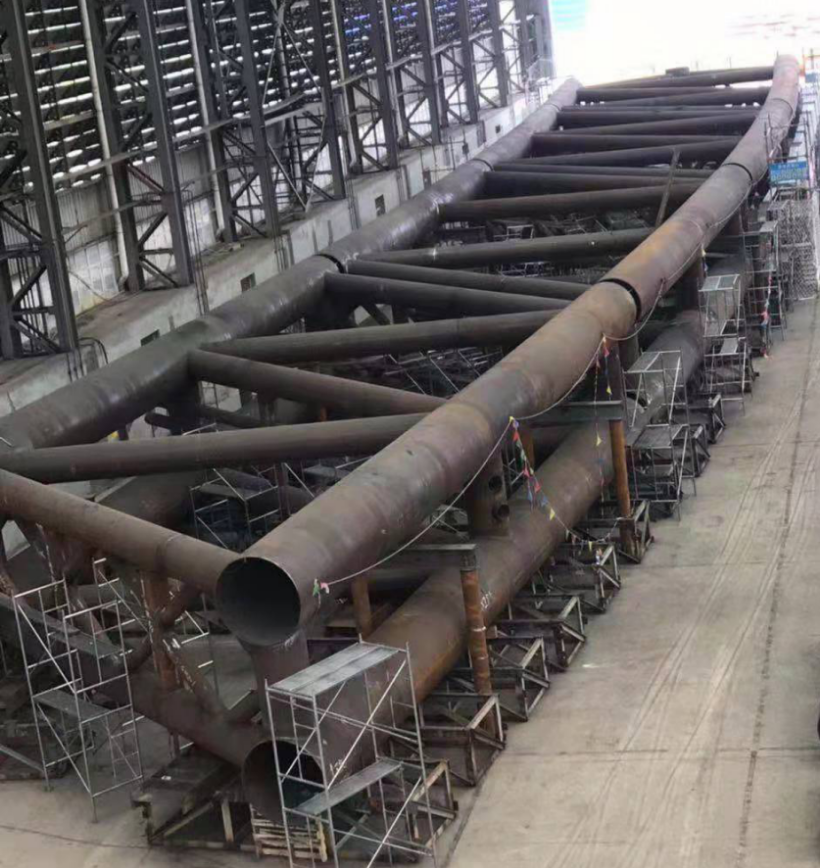 ? 犍為岷江特大橋是公司繼商合杭淮河特大橋、恩施找龍壩特大橋之后承建的又一座特大跨度鋼管混凝土拱橋,主跨457.6米,鋼結構用工程量12000余噸。項目自開工以來公司精心組織,克服了工期緊、任務重及焊接質量要求高等困難,在成熟的施工經(jīng)驗基礎上不斷改進細節(jié)、提升設備能力、優(yōu)化資源配置、完善工藝方案,先后攻克了Q390D-Z25厚鋼板焊接、相貫線焊縫焊接及修磨、拱肋節(jié)段臥式拼裝工藝控制等技術難題,優(yōu)質高效的完成了主拱肋首輪節(jié)段制造和試拼裝施工,為鋼管拱按期合龍奠定了堅實的基礎。