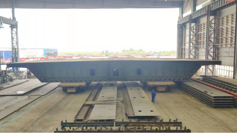 上午11時,隨著現(xiàn)場總指揮一聲令下,重達(dá)240余噸的首個鋼箱梁節(jié)段由兩臺150噸自行式液壓平板車緩緩抬起,平穩(wěn)脫離總拼胎架并駛出廠房,標(biāo)志著首輪6個節(jié)段拼裝完成并正式下胎,轉(zhuǎn)入室外臨時存放區(qū)。