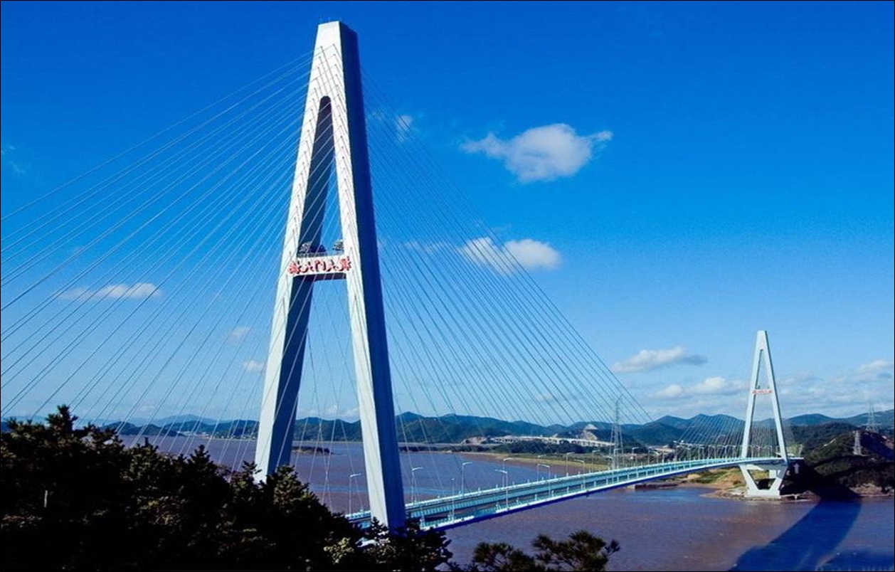 4、工程簡介:桃夭門大橋是舟山大陸連島工程的第三座跨海大橋,跨越桃夭門水道,連接富翅島和冊子島,全長888米,橋面寬27.6米,主橋?yàn)橹骺?80米的雙塔雙索面半漂浮體系混合式斜拉橋,橋跨布置為48米+48米+50米+580米+50米+48米+48米,主塔高151米。
