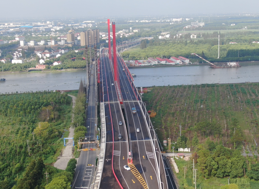 葉新公路泖港大橋工程位于上海市松江區(qū)泖港鎮(zhèn),線路為東西走向,新建泖港大橋于2018年4月動工興建,主橋一跨過河、采用鋼塔鋼箱梁平行單索面斜拉橋,塔梁固接、塔墩分離體系,主橋跨徑445米,其中主跨225米,主塔高60米,主跨寬38.5m,為一級公路,雙向6車道及人行道、非機(jī)動車道。此前,2020年5月20日,新建泖港大橋?qū)崿F(xiàn)主橋合龍。