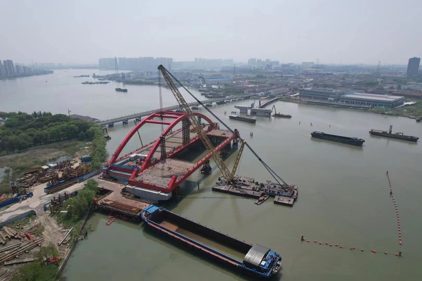 勝浦大橋140米跨鋼箱系桿拱位處吳淞江航道中心,過(guò)程中需要邊通航邊施工,安全風(fēng)險(xiǎn)高,管控難度極大。在新冠疫情常態(tài)化、天氣多變等諸多不利影響下,圍繞施工生產(chǎn)重難點(diǎn),積極開(kāi)展課題研究和技術(shù)攻關(guān),保證了各重要分段的順利完工。